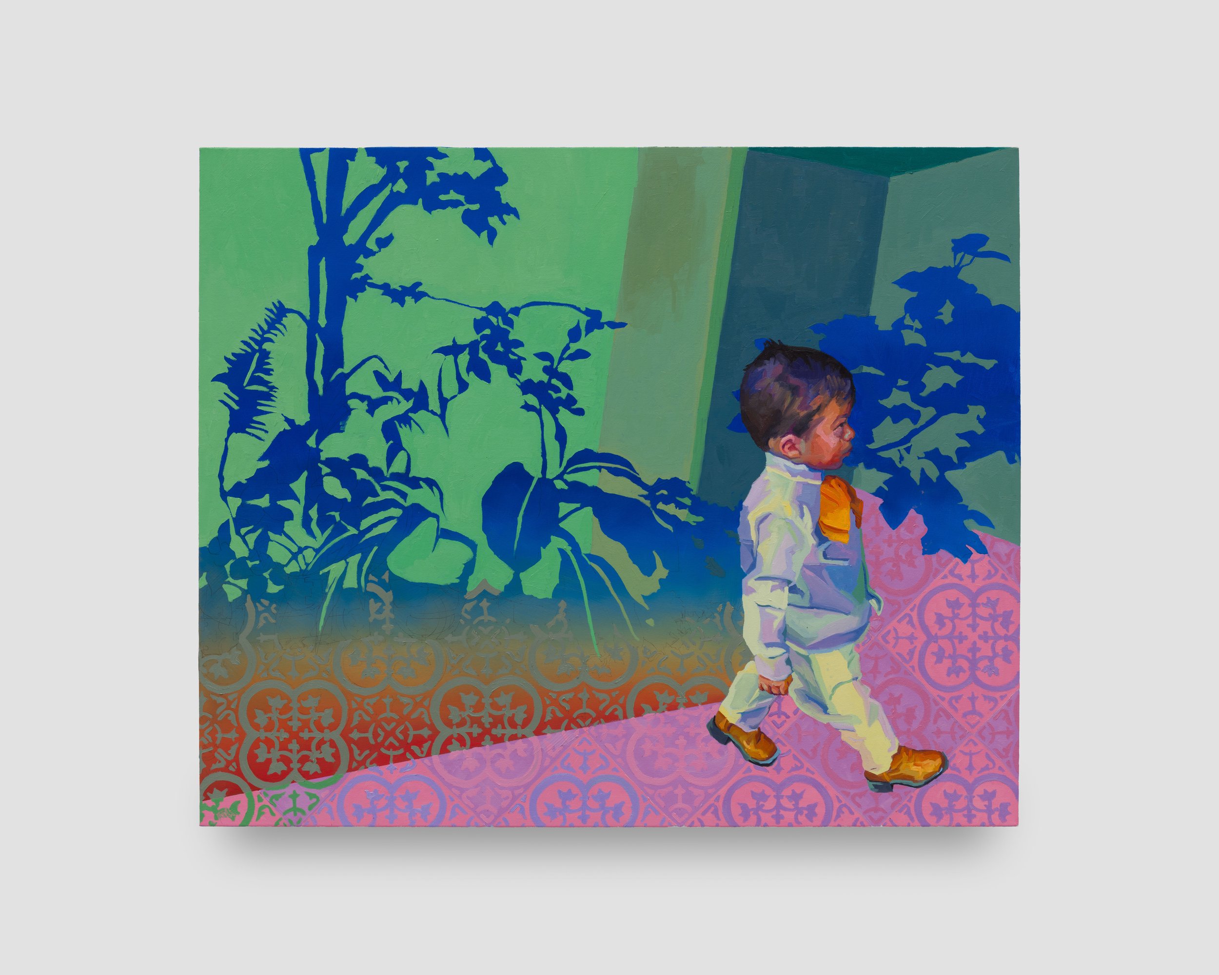 Many of the works in the exhibition dwell on García Hamilton’s late grandfather and her young nephew, his great-grandson. Though the two never met, the young boy’s resemblance to his ancestor in looks and manner proves the strength of blood as it moves through time and space. The two appear together in La tejana de mi abuelo. In this poignant tribute to her grandfather, his portrait – one of the few images of him hatless – hangs in an elaborate frame reminiscent of a home altar. Just above, his cowboy hat hangs in a dust bag on the wall. Deep purple fades into blue around the hanging portrait, as if to signify the sun setting on one generation. A golden snapshot of his young great-grandson tucked into the bottom corner of the frame reminds us that hope is found in the legacies passed to new generations. The lush En el Jardín de mi abuelo finds the same young boy confidently striding across beautiful tiles of the family’s ancestral Guadalajara home.