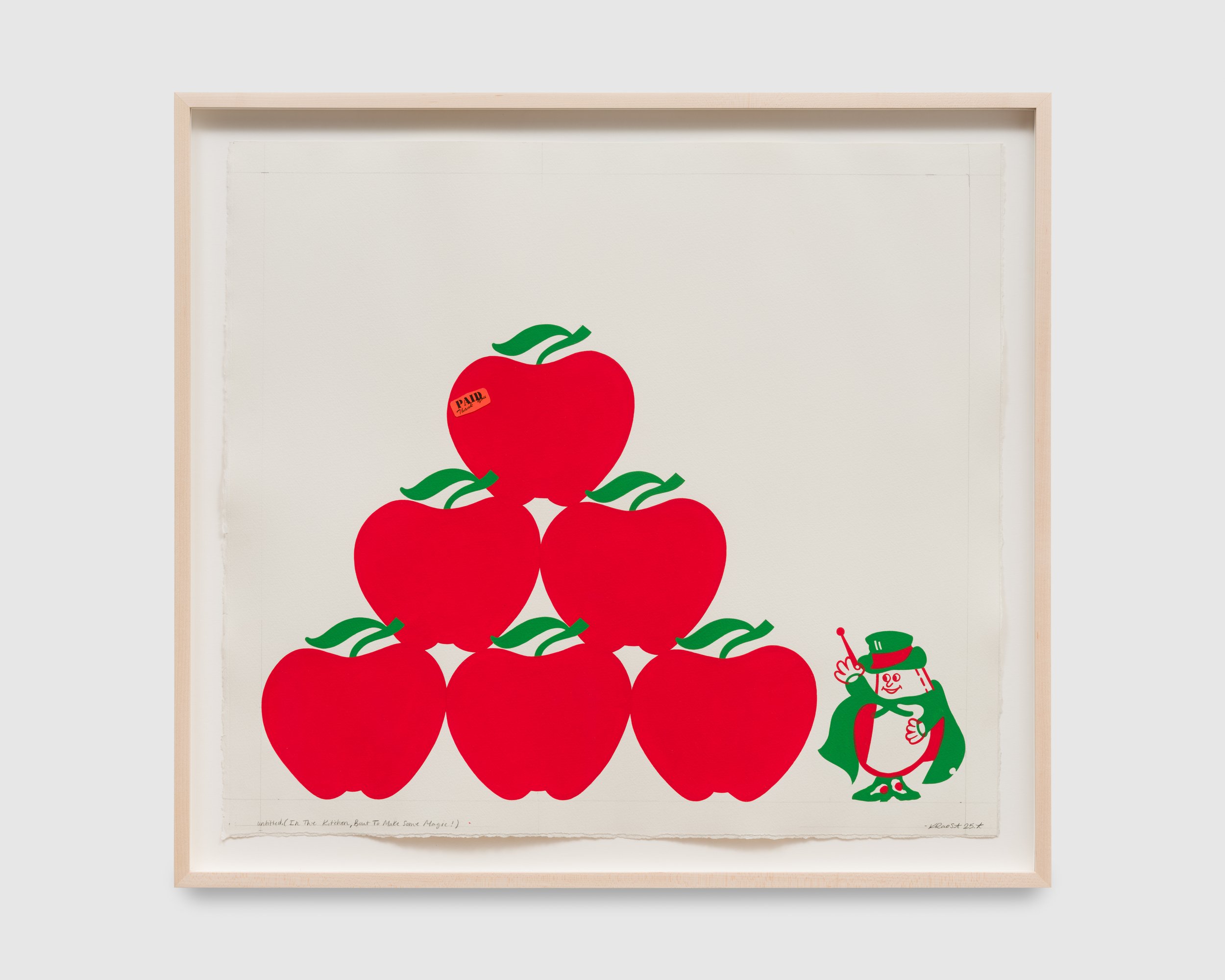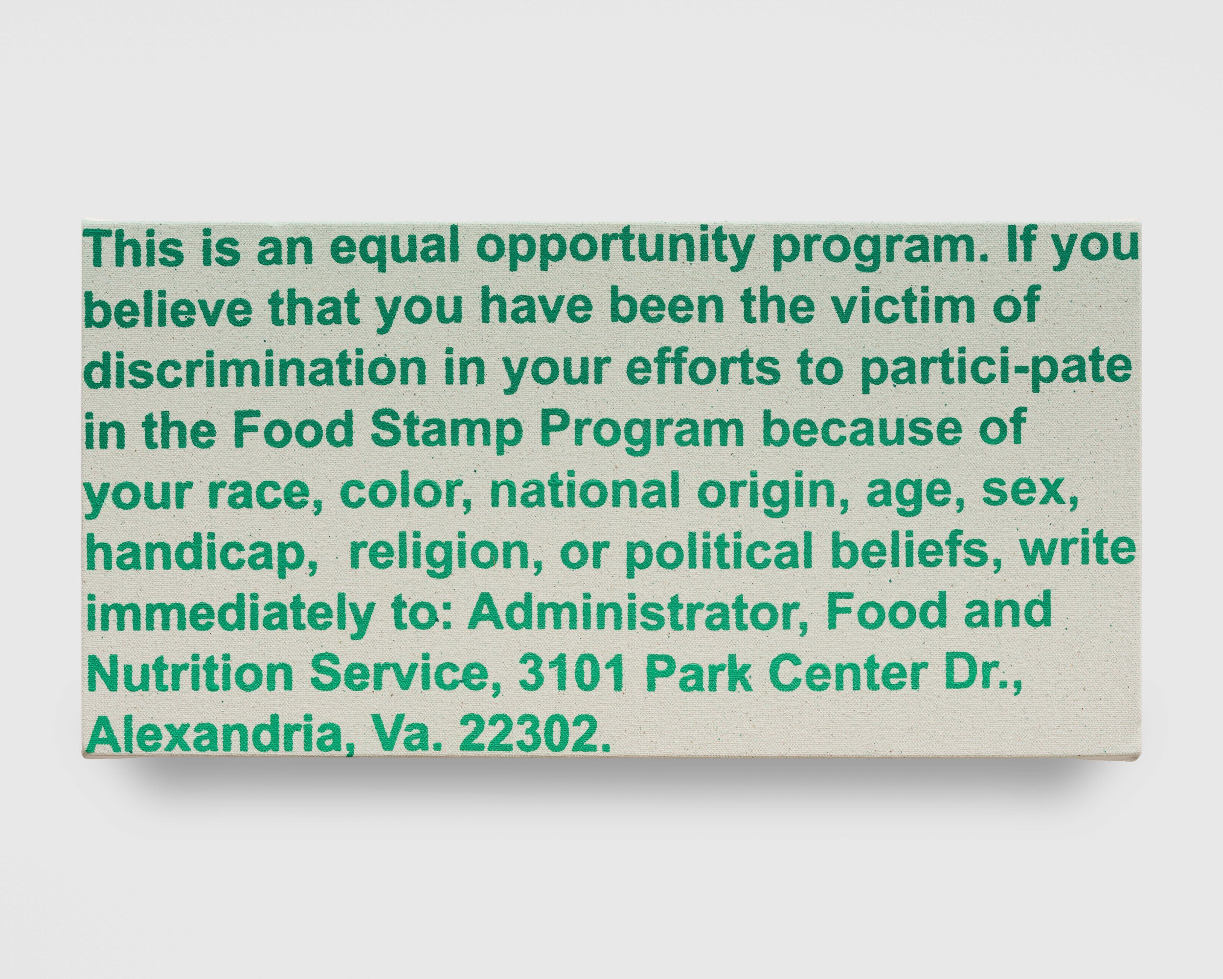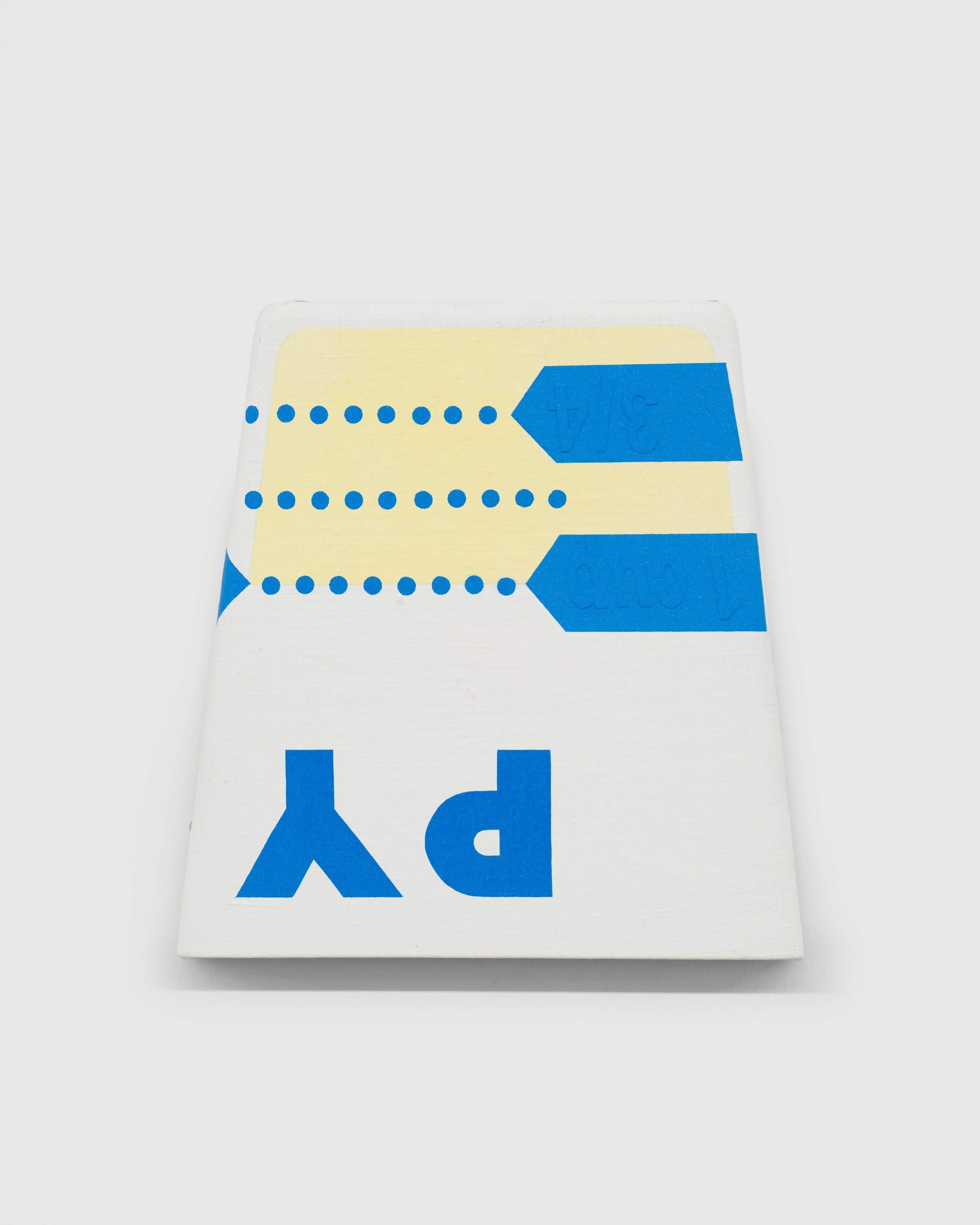 Raos brings to his work a deep knowledge of and admiration for his art historical precedents. The vibrant bands of color in Untitled (Outchea getting bread, if you wonder where i’ve been) read like Ellsworth Kelly’s iconic Red, Yellow, Blue paintings turned ninety degrees. But the work also refers to the Wonder Bread factory outlet, whose discounted near-expired foods were a staple of the artist’s childhood. Untitled (Never had the tools), meanwhile, takes its subject and altar-like shape from John Baldessari’s 1988 Banquet, calling into stark contrast the states of plenty and lack on display. Raos gives himself a seat at the table, though, his name playing like alphabet soup across the oval bowl of the spoon.