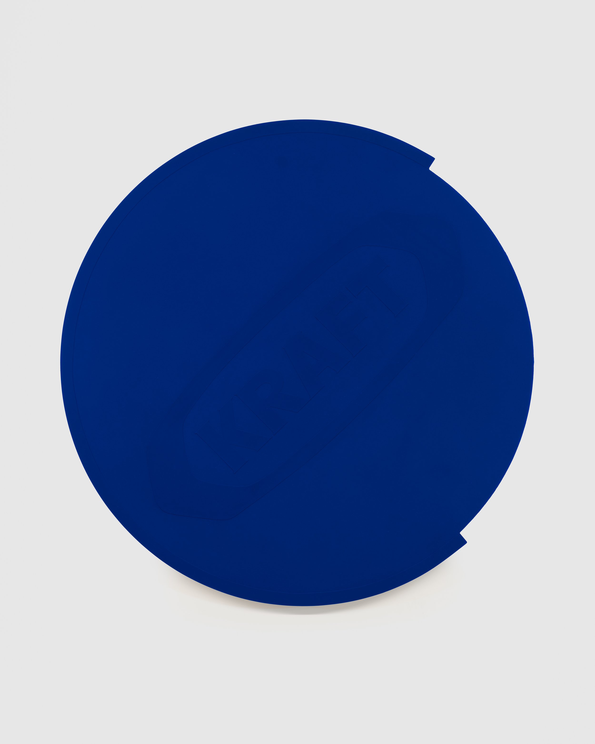 Mingling high and low referents has become a signature for Raos, whose elegant lines often conceal collected bits of the gently decrepit Los Angeles he inhabits. His eye is attuned to the comic potential of the city’s palimpsest, finding aesthetic value in juxtapositions and refuse. Untitled (Space Kraft, Miracle Whip) recreates a fractured plastic jar lid picked up off the street. Its shaped canvas carefully reproduces the sheared edges of its referent, transforming a beat-up found object into a vehicle for precision and perfection. The elevated, vibrant blue retains roots in the scratched-up Kraft plastic, the same scratched blue of the plastic chairs that filled the waiting rooms of government assistance offices. The color palette of midcentury idealism, filtered through high-art minimalism on one hand and the aesthetics of administration on the other, reconverge in Raos’s confident hand.
