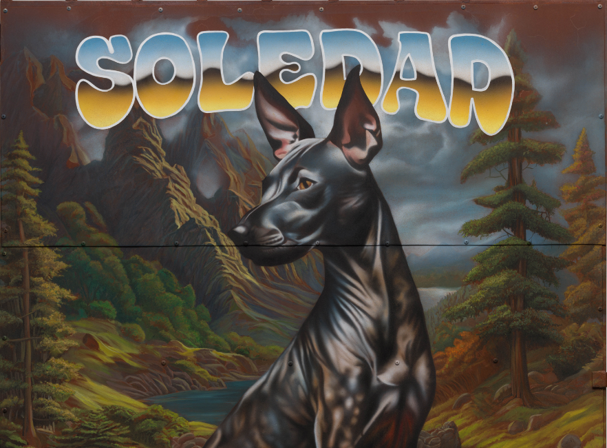 Several of the works incorporate fantastical imagined landscapes, their soft focus reminiscent of dreams or vintage cartoons. Juarez’s titles convey a sense of contemplative quiet that seems at odds with the flashy sonidero text style that bears them. Many include images of Mesoamerican step pyramids, and two smaller works directly juxtapose the pyramid with a turreted, European-style castle, each bearing a single towering structure at the end of a wandering path. Elsewhere, a sleek, ropily muscled Xoloitzcuintli sits at alert in three-quarter view amidst a serene landscape. Dating back to a thriving pre-Columbian past, both the pyramid and the Xolo serve as symbols of Mexican heritage and pride.