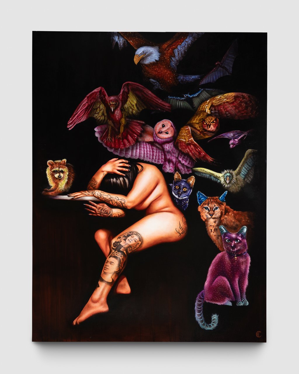 Two of the large paintings recast classical demons as Mexican alebrijes, ancestral spirit guides in the form of brightly-colored creatures. Sueños takes as its inspiration Francisco Goya’s The Sleep of Reason Produces Monsters, substituting Goya’s benighted European gentleman for a tattooed Chicana nude, while Pesadillas Con Gatijos reimagines Henry Fuseli’s The Nightmare, replacing two menacing monsters with magical renditions of artist’s two beloved cats. Cansino’s paintings look to the 18th century not just in subject, but also in execution. Using a traditional grisaille technique, she completes the detailed linework in underpainting before adding color and shading in built up layers of glaze. This results in richly toned, deeply saturated color that also seems to catch and refract light.