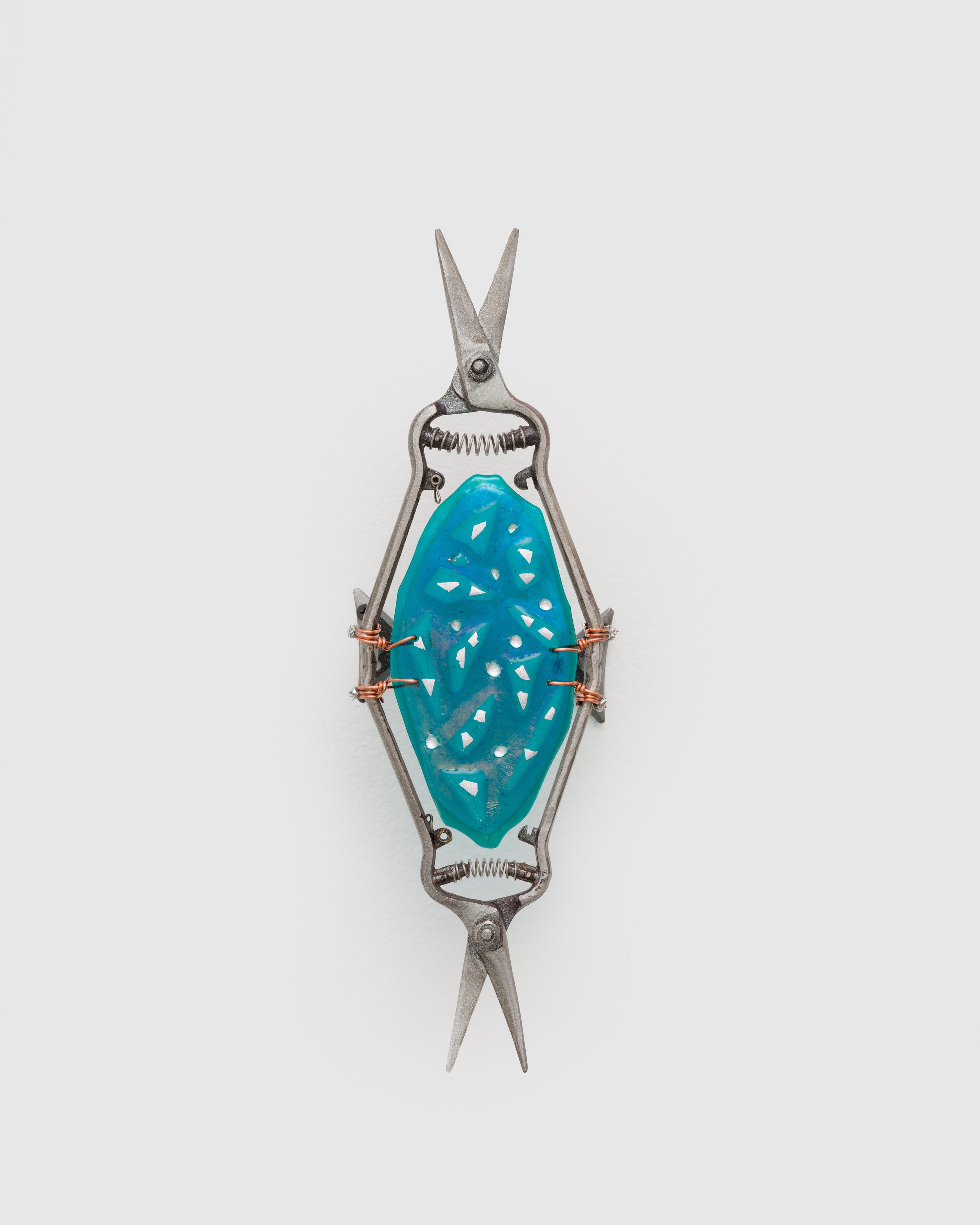 olivas’ objects are imbued with duality: beauty and utility, sharp and soft, earth and heaven. All of these elements come to play in four wall-based sculptures from his Feeding the Birds (Mojuba Iyaami) (2024) series. Here, gardening shears of various sizes have been transformed into opulent devotional objects representing Iyaami, the sacred mothers of Yoruba tradition. These figures often take the form of birds, and olivas’ shears – turned upright, adorned with glittering glass, and trailing braids and beads – recall birds in flight. Bodies of collaged dichroic glass, used primarily in satellite technology, have been kiln-fired to a colorful iridescent sheen that projects our collective prayers into the heavens.