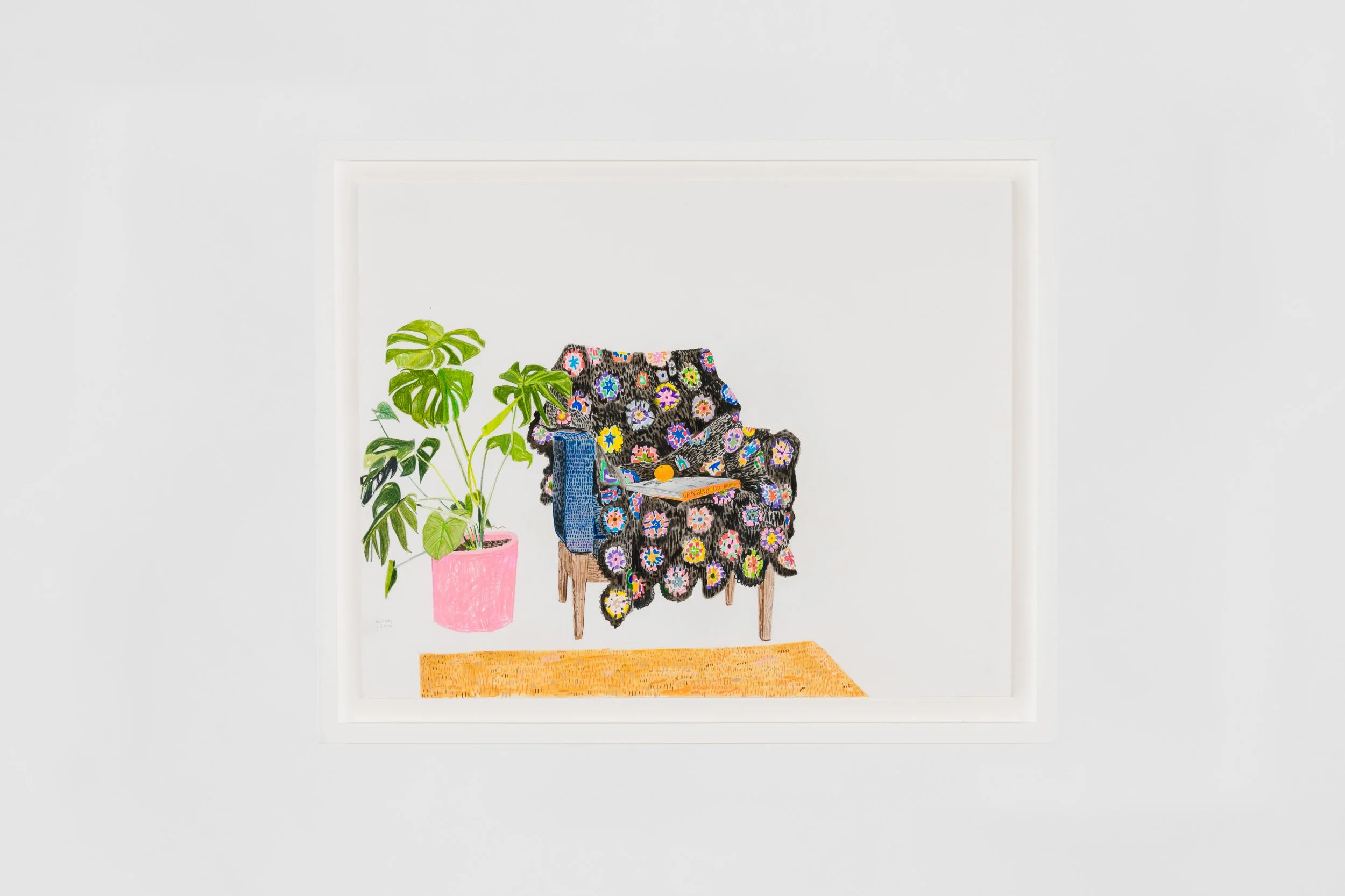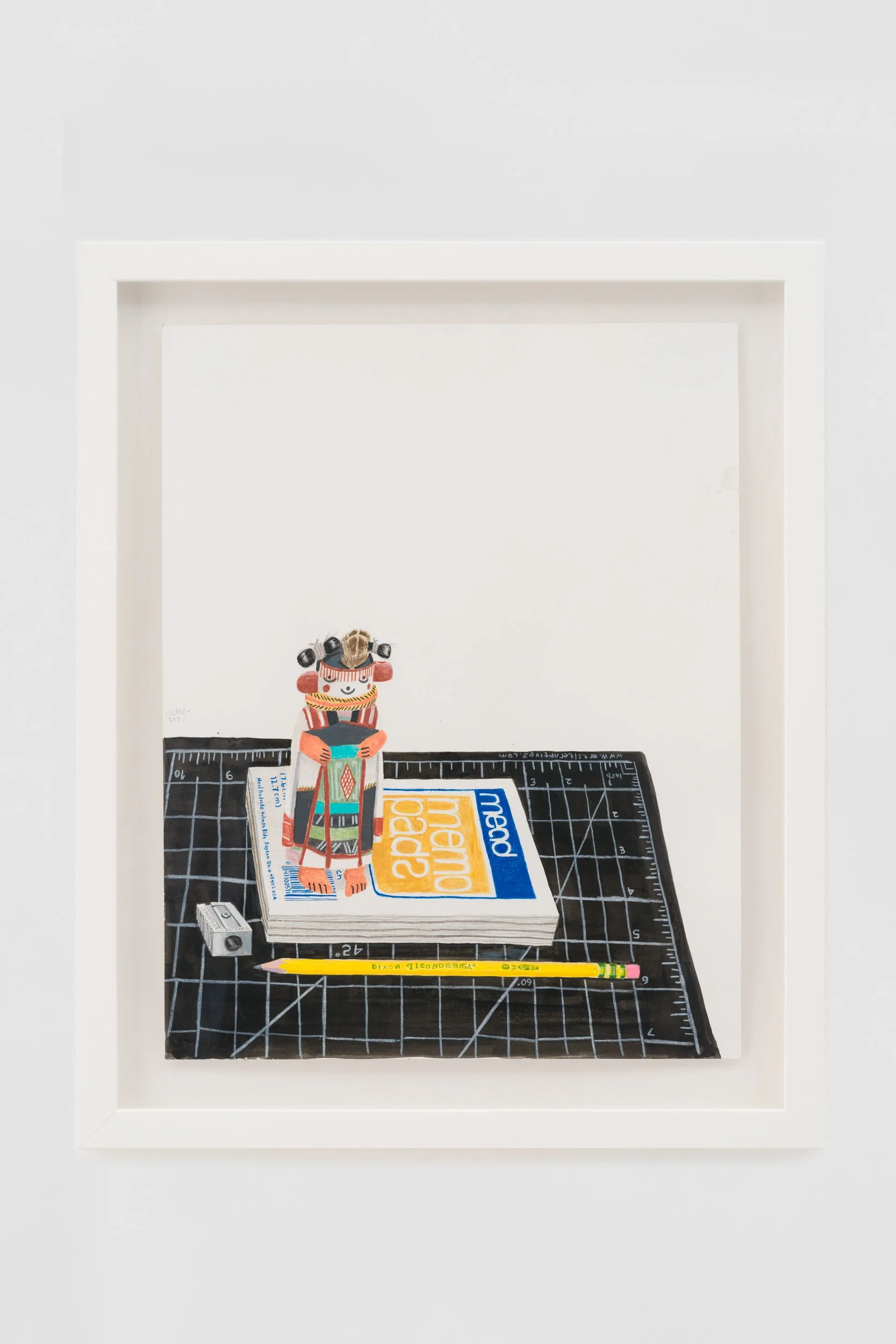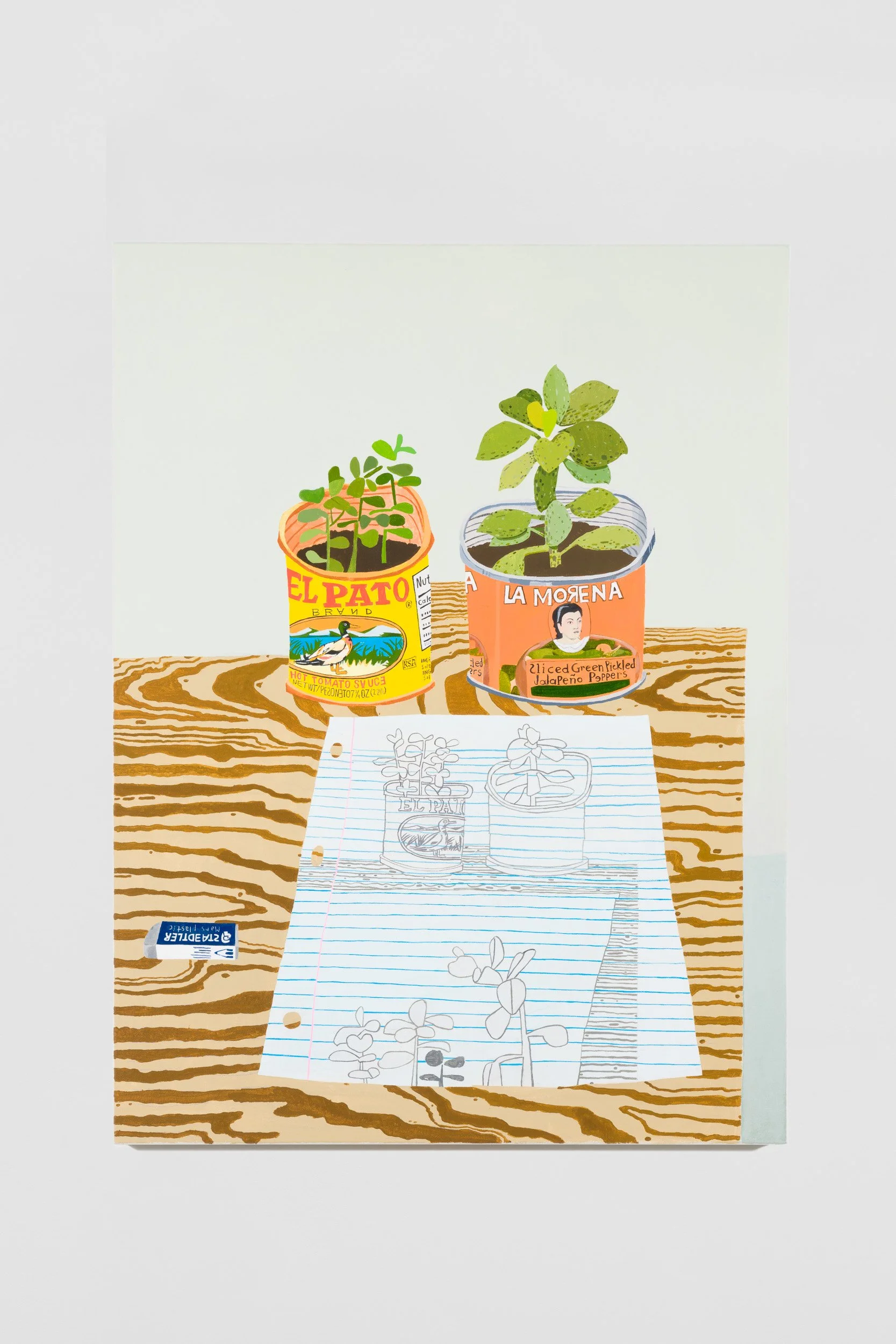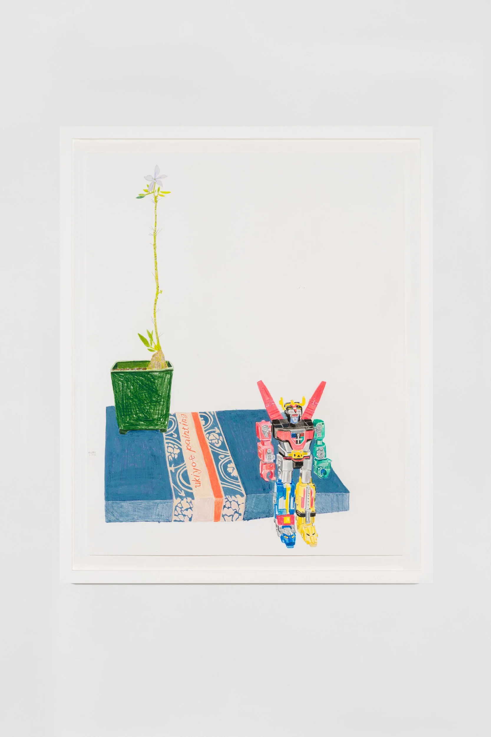 For this work/exhibition, I’ve relied on my interest in drawing and in the objects that orbit me on a daily basis, objects that exist within my own personal space but that also inhabit a broader and shared cultural world, objects that I always gravitated towards but often ignored because of their mundanity. The drawings came first, as I have been trained in the traditional way of making 2-D art, through direct observation. The work expresses certain interests that have been ingrained in me since I was a child: a love of books, plants, colors, and toys, which in turn inform my present thoughts. The works are careful explorations of form and color, of materiality, touch, and the presence of certain objects. I created most of the drawings during the Covid-19 lockdown from direct observation, always with attention to detail, confident lines, whimsical marks, and the flattening of space. What I love about drawing is its immediacy, the subtle mark-making, and the ability to take away my boredom. The paintings emerged from the drawings, and therein lay the fun problem at the center of the show, that of translating the drawings into paintings, making the paintings “act” like drawings. I am always looking to learn from many different artists. I looked hard at the work of David Hockney, Mamma Anderson, Jacob Lawrence, Diego Rivera, Hillary Pecis, and Horace Pippin, among others. I looked at Pre-Columbian codices, childhood cartoons, and painted signs found all over East LA/Boyle Heights, and this show seeks to engage in a visual conversation with all of these elements. I look to both the sublime and the commonplace. I excavate Mexican American culture, fine art history, and rasquachismo, and make them mine.