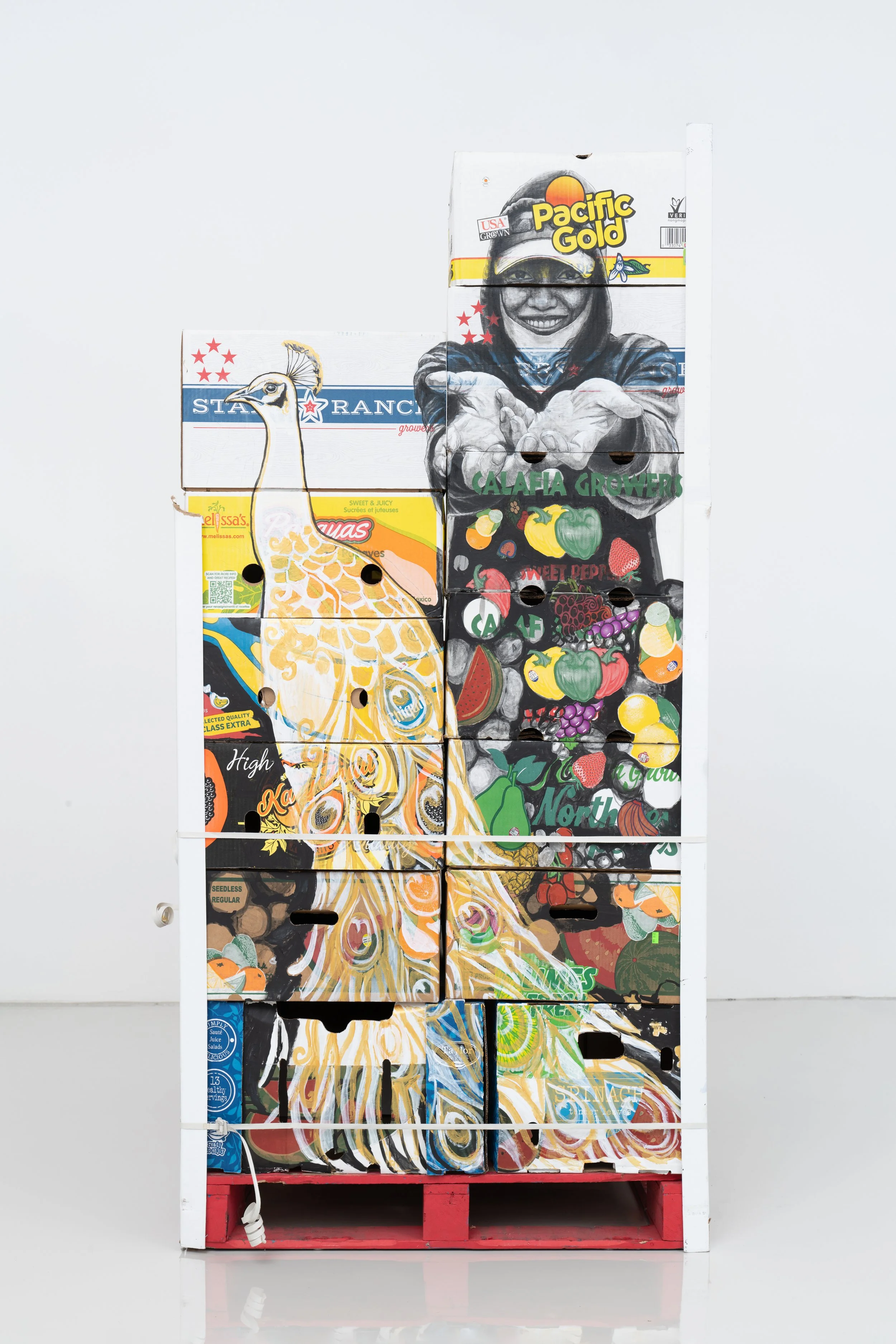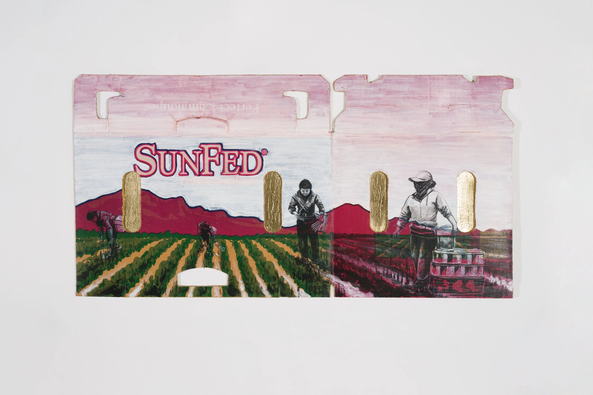 Narsiso Martinez’s work originates from his lived experience as an immigrant and a farmworker. His work is in dialogue with European Realist painters like Jean-Francois Millet and 1930s-era Social Realism, in particular the Mexican muralist movement. Martinez uses drawing, painting and sculpture to depict portraits and scenes of American farmworkers at work in the fields. His works are frequently executed on the surfaces of discarded produce boxes that Martinez retrieves from various markets around Long Beach and Los Angeles.