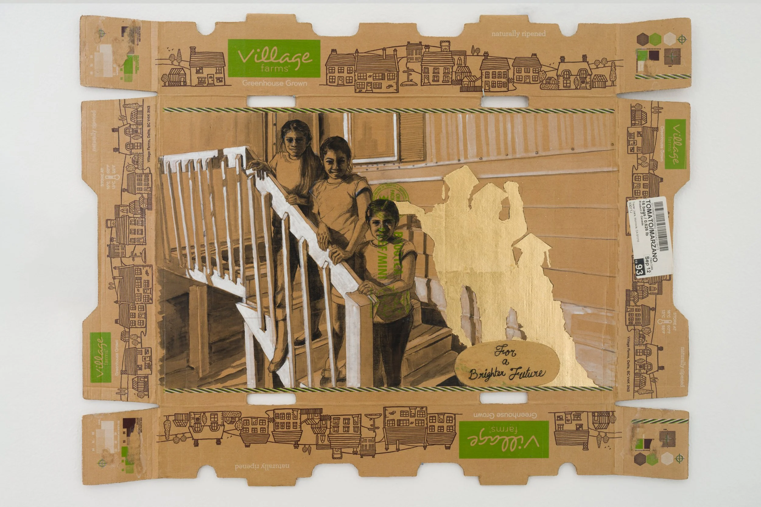 In Tender Leaves, Martinez will exhibit a new series of farmworker portraits amplified by his most ambitious sculptural piece to date and an installation in the rear gallery of the space that recalls in style and material the works of Kara Walker. A tone of increasing concern runs through the works in the show for the state of constant precarity farmworkers live under in America. Martinez brings the dialogue closer to the viewer / consumer in this show, with his series of citrus worker portraits executed on deconstructed Trader Joe’s orange juice boxes. Larger scale portraits in the show exude detectable elements of fear and alarm in the eyes of the subjects. Other figures beckon warmly, openly, suggestive of the immeasurable contributions made by American farmworkers. The works in Tender Leaves seek to valorize the farmworkers that fill grocery store produce sections around the country, and also to decry their systemic and comprehensive vulnerability.